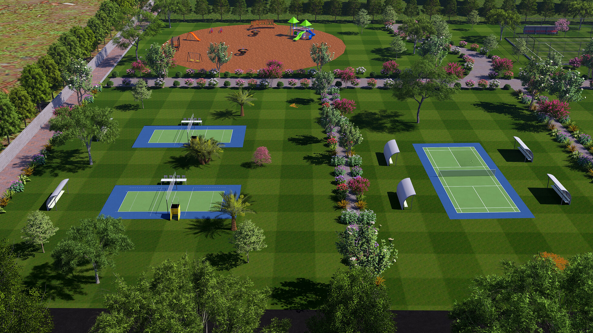 State-of-the-art sports facilities including tennis courts and swimming zones, designed to enhance physical endurance and life-force.